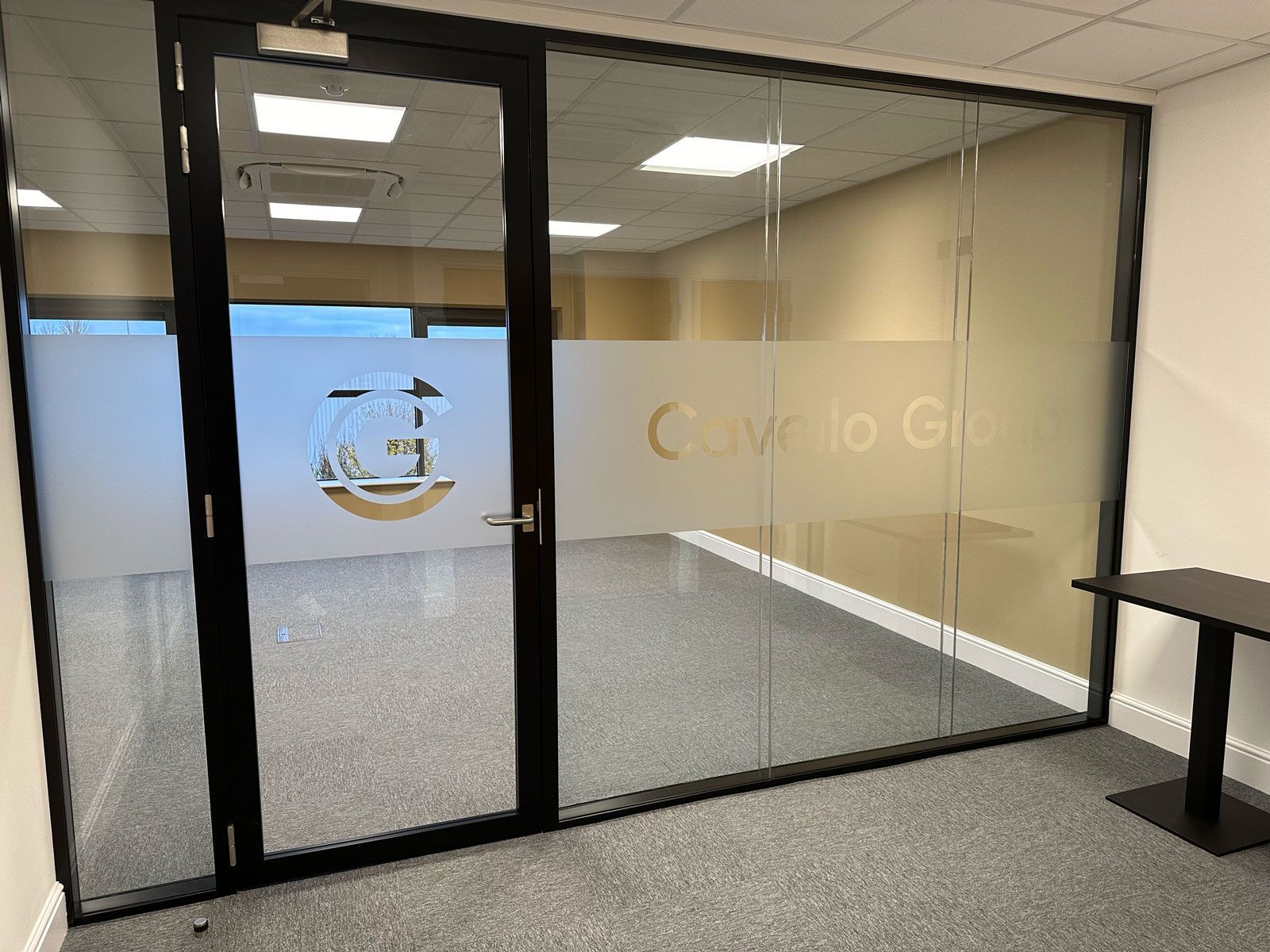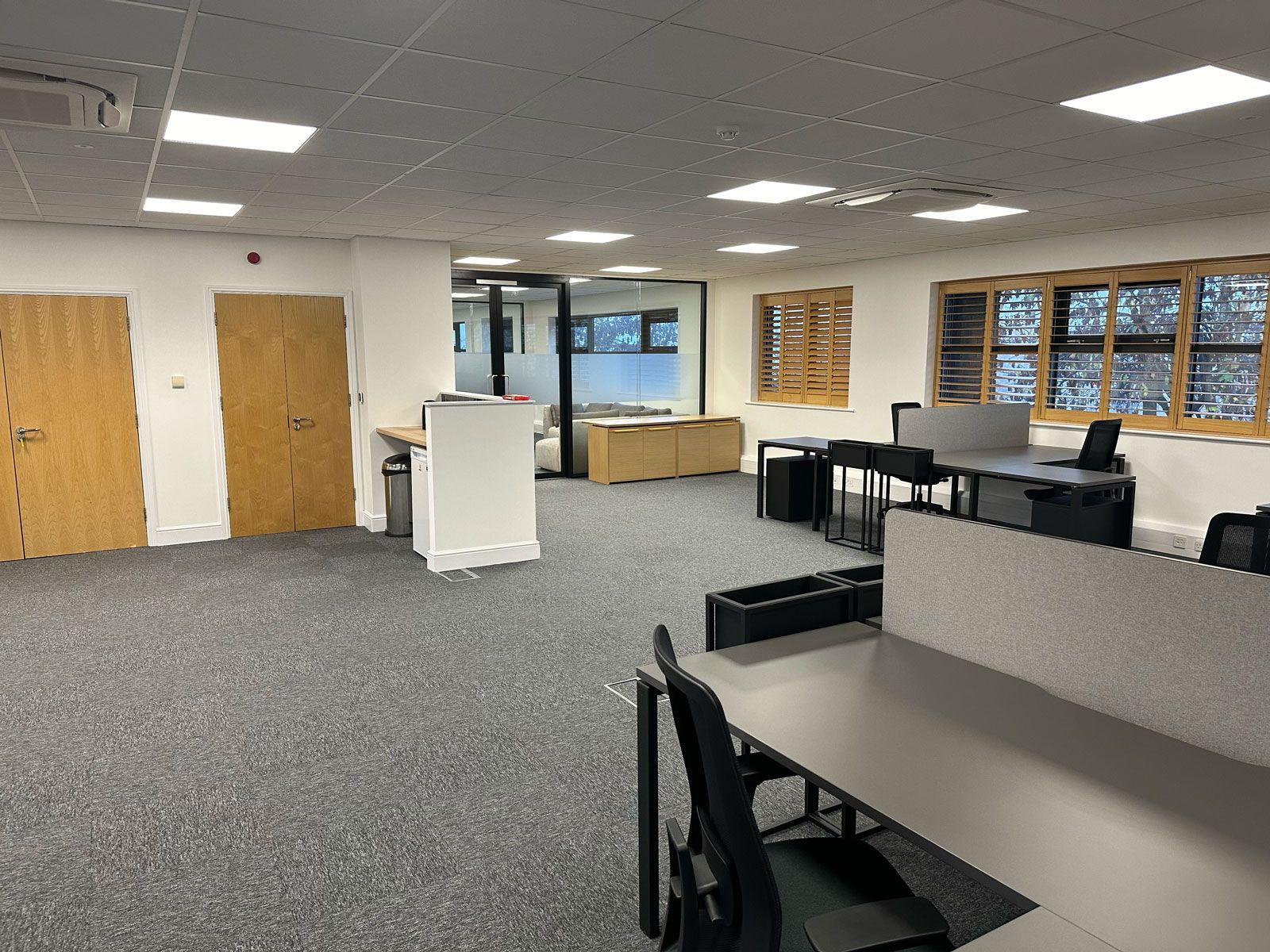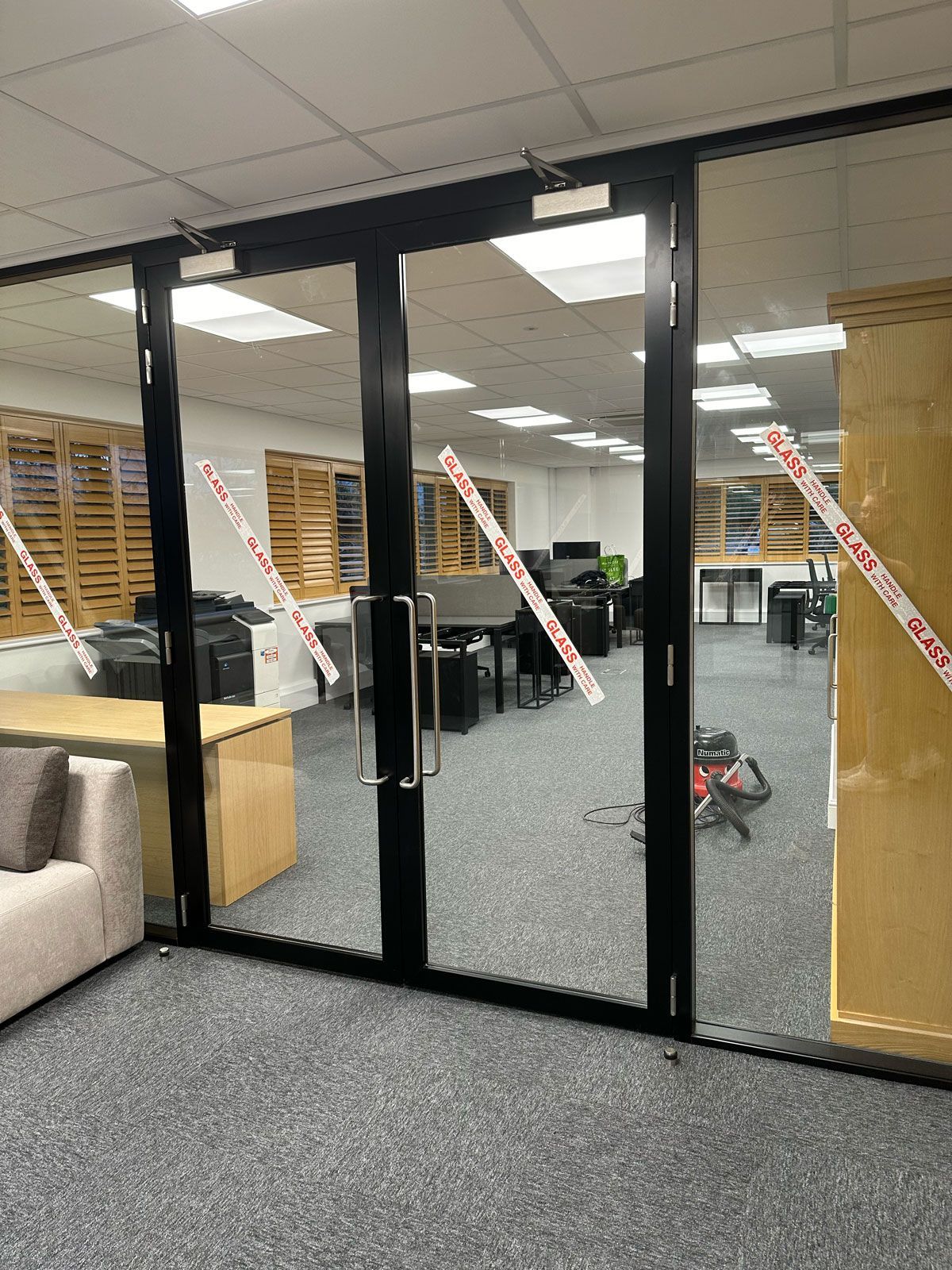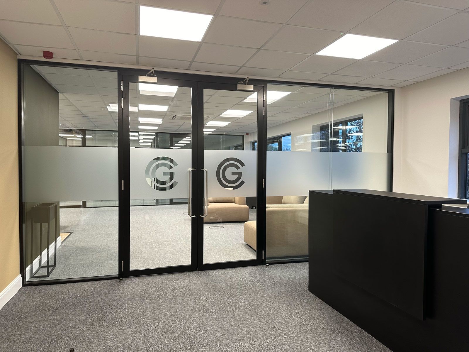 Reception area looking towards the main office, double glazed doors and partition.